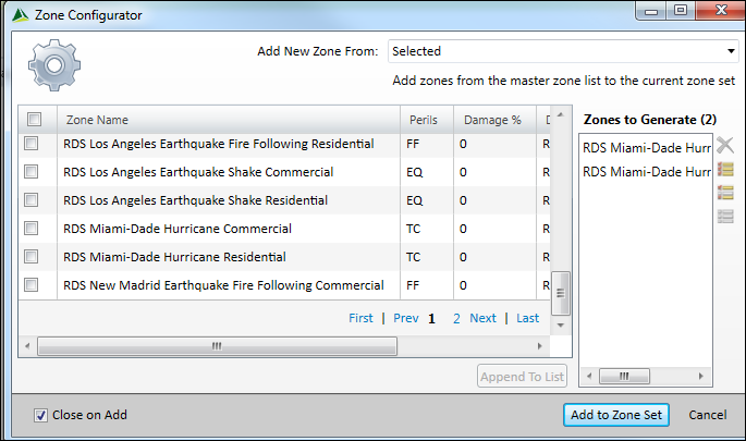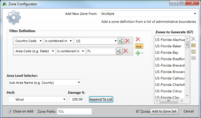 To create a zone containing states in the United States, select Multiple and define a filter where Country Code is contained in US. In the Area Level Selector list, select Area Code (e.g. State) to specify the resolution of the zone. Select a peril, assign a damage %, and then click Append To List. The Zones to Generate pane includes 51 zones (50 states and the District of Columbia). Enter a zone prefix (optional) and then click Add to Zone Set.