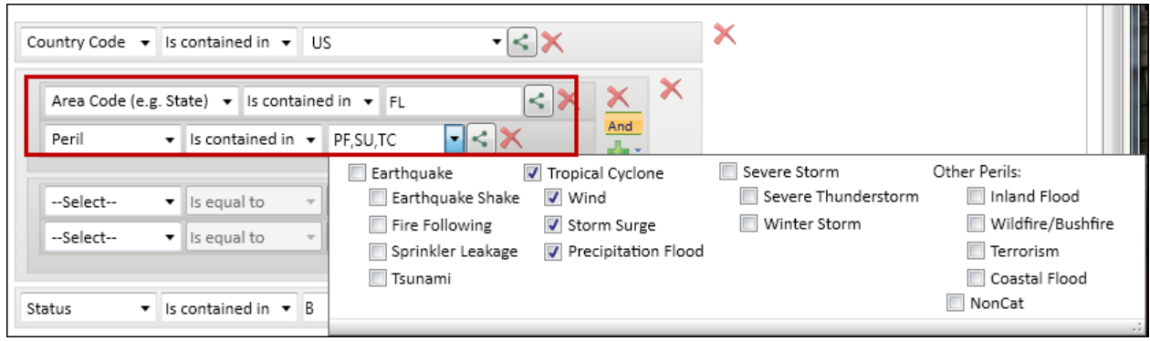 The filter tells the system to include all exposures in Florida insured for the Tropical Cyclone peril.